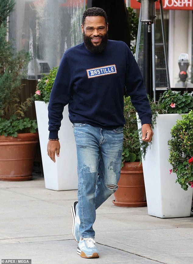 Slim: Anthony Anderson confirmed off his slim kind on Friday. The black star, 52, appeared match and trim in a navy blue Bastille sweatshirt, patched denims and blue sneakers as he strolled by way of Beverly Hills