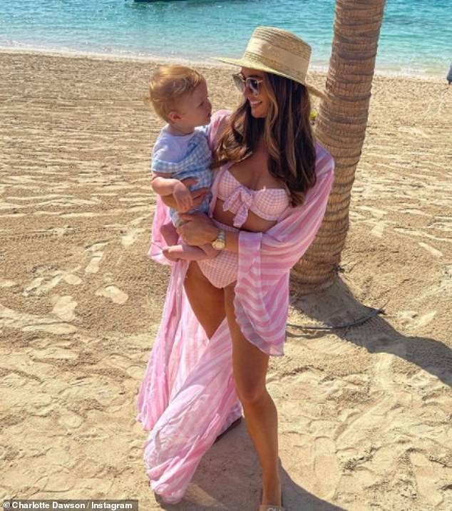 She’s been basking within the solar in Dubai together with her fiancé, Matthew Sarsfield, and their 13-month-old son, Noah.