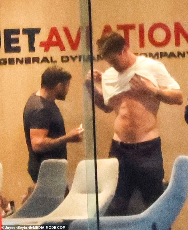 Chris Hemsworth, 39, (proper) confirmed off his prized six-pack abs to his private coach Luke Zocchi (left) as they waited for his or her personal jet to take off from Sydney on Friday