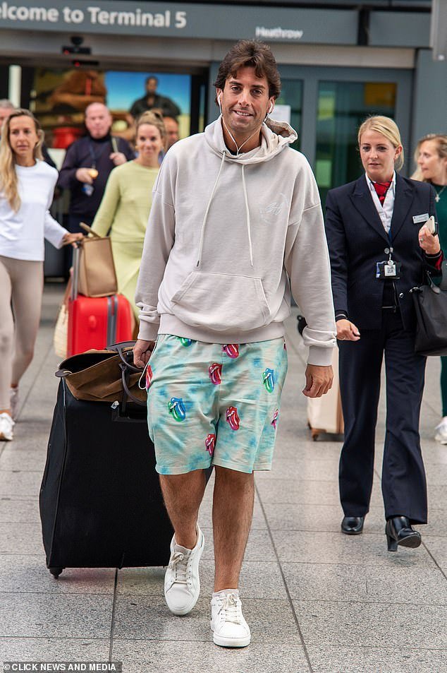 Residence candy residence: A slim James Argent, 34, reduce an informal determine in a hoodie and Rolling Stones shorts as he landed at Heathrow after touring to Barbados with pal Mark Wright on Wednesday