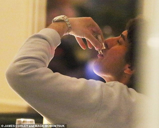 Enjoyable occasions: James Argent was having fun with a chew of oysters whereas eating with associates Bobby Norris and Joe Garratt on Wednesday at Langan’s Brasserie in Mayfair, London