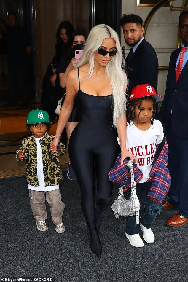 Stepping out! Kim Kardashian flaunted her latest weight reduction as she left her NYC lodge along with her two sons, Saint and Psalm, on Tuesday
